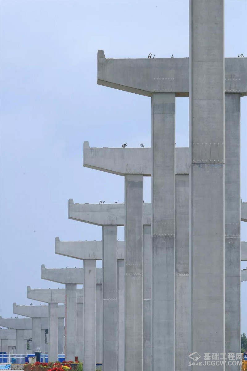 昆阳路越江大桥南岸引桥共计预制立柱92节,预制盖梁32榀,其中双节立柱28根,最低的双节立柱为14.64米,最高为23.15米。双节双根的拼装工艺不仅在难度、精度上迈上了新台阶,且创造了上海预制拼装立柱高度新纪录。