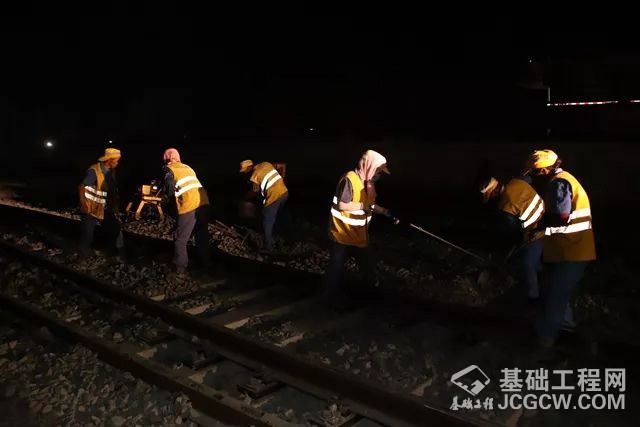 傍晚的建湖高铁站有一丝冷意,现场施工人员却汗流浃背,重复着“起道——回砟——捣固”这固定的程序,截止到23时58分,该站102#、104#道岔捣固完毕。