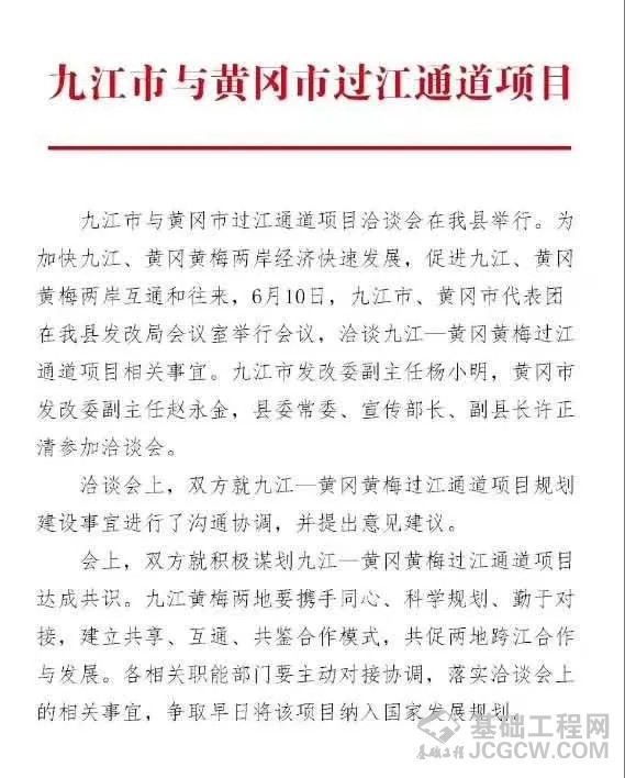 洽谈会上双方就九江、黄冈黄梅过江通道项目规划建设事宜进行了沟通协调,提出意见建议并达成共识。九江黄梅两地要携手同心、科学规划、勤于对接,建立共享、互通、共鉴合作模式,共促两地跨江合作与发展。