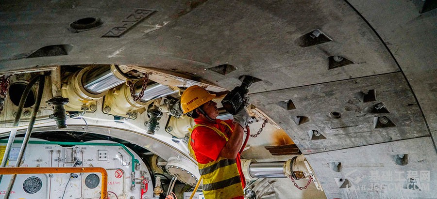 一名工人正在紧固管片螺栓。