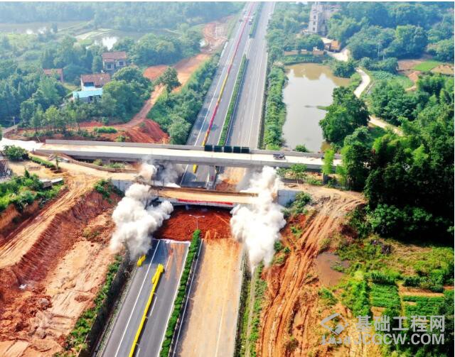 湖北沪渝高速黄黄段K766+200处天桥成功爆破拆除