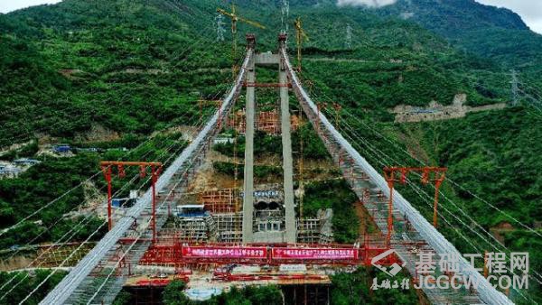 据了解,金安金沙江大桥是华丽高速公路控制性工程,桥型设置为主跨1386米双铰板桁结合悬索桥。大桥共设两根主缆,单根主缆由169股预制平行钢丝索股构成,每根索股长约2045米。成桥阶段、主缆最大缆力将达到6万吨以上。主缆架设采用一套双线往复式牵引系统来完成索股牵引。