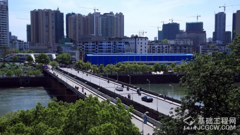 秀江双桥桥面全长196m,其中河面宽度136m,桥面到河床高度约10.5m,全桥共有7座桥墩8跨,其中水中5座桥墩6跨,全桥为重力式桥墩承重结构。下游一侧为上世纪50年代建成的钢筋混凝土变高度连续梁结构桥梁,整体性好,刚度大,强度高,不易解体;上游一侧是上世纪60年代建成的钢筋混凝土连续双曲拱桥,由于长年负重运行,该桥技术安全性已经不能满足通车安全,经技术鉴定为D级危桥,结构安全性较差。双桥在整体结构上既有共同点,也有明显差异性,即:双桥都是重力式桥墩承重结构,但桥梁上部结构的强度及安全性差异明显,加上施工期正值汛期,秀江水流湍急,这些都给爆破钻孔和防护施工作业带来了挑战性。