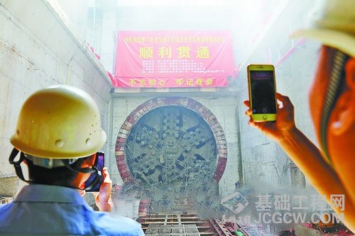 施工人员纷纷举起手机,拍下盾构机贯通隧道的一幕。