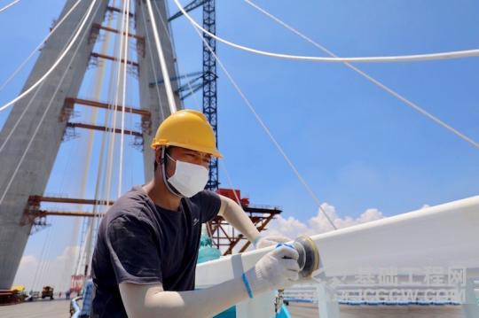 图为工人正在桥面上加紧施工。