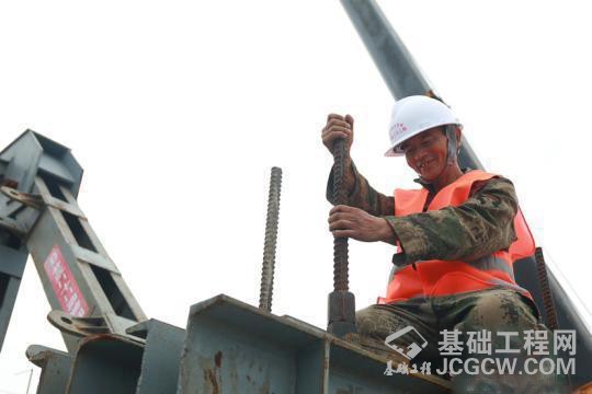 图为工人在牡佳客专佳木斯特大桥对精轧螺纹钢吊杠进行垂直固定