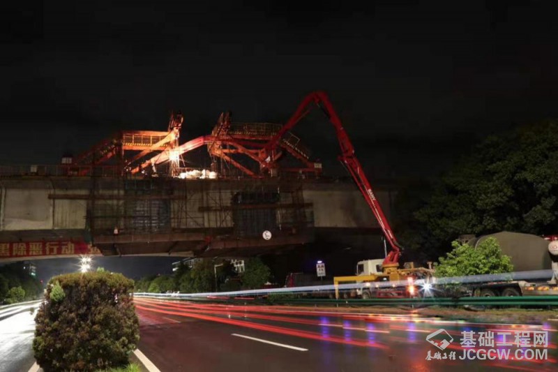 8月4日夜,位于黄岩区的黄椒路主干道上,工人们紧张地做着合龙前的最后准备。在前期施工中,主跨梁大部分已浇筑完毕。两个相隔100米的桥墩是基点,通过悬灌梁施工工艺,高架路面一点一点往中间延伸,即将要浇筑的就是主跨中间的最后两米。