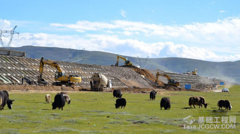 图为8月10日,改建工程施工现场附近草场牦牛成群,一幅和谐景象。