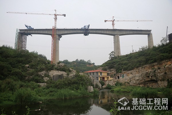 该桥位于泽州县金村镇十字坂村,全长755.43米,包含(48+80+48)m连续梁一处。所在地沟深、谷陡、跨径大,大桥主墩最高45米,桥面距丹河水面垂直距离达74米。施工期间,建设者克服不利地形条件,注重水域保护和施工安全,采用挂篮悬臂现浇施工工艺,用时200余日,圆满筑就丹河之上首座高速铁路桥梁。