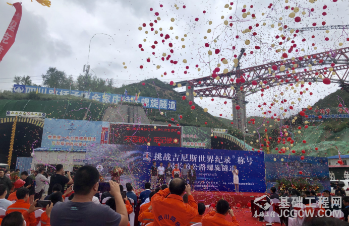 金家庄隧道为分离式特长隧道,左线长4228米,右线长4104米,曲线半径860米,克服高差达80米,隧道通过螺旋展线270度,把纵向坡度降至1.91%,实现原地抬升112米,完美地解决了线路爬升及避开地质不良地段的难题。吉尼斯世界纪录认证现场。