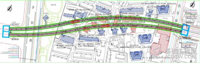 该工程采用一台直径11.58米泥水平衡盾构,自3月23日从2号工作井始发,穿越济阳路高架进入100米试验段,于5月15日进入济阳小区,工程实施范围为济阳路至长清路,总长857.4米,其中盾构段南线长544米,共362环,正上方穿越济阳小区6栋居民楼、侧方8栋居民楼,至7月29日南线盾构正式进洞。