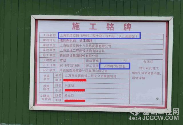 下面是上海轨道交通18号线长江南路站的施工铭牌,这里明确表示了土建工程的完成时间是2020年3月。