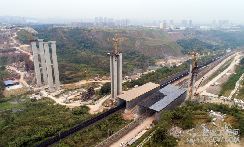核心提示: 俯拍重庆渝(北)长(寿)高速公路扩能项目1标新房子特大桥施工现场,渝怀铁路上火车来往频繁,该桥目前已开始挂篮拼装,正式