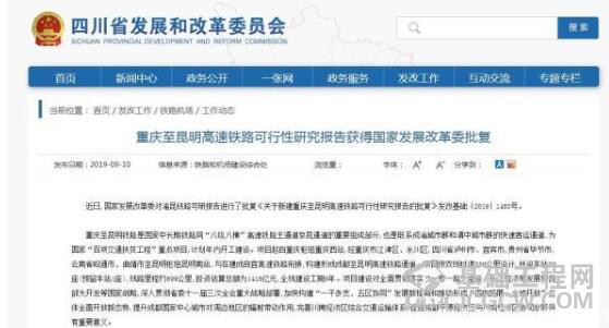 2019年9月10日,四川省发改委挂出了一则消息:重庆至昆明高速铁路可行性研究报告获得国家发展改革委批复,计划年内开工。
