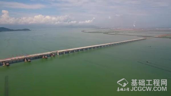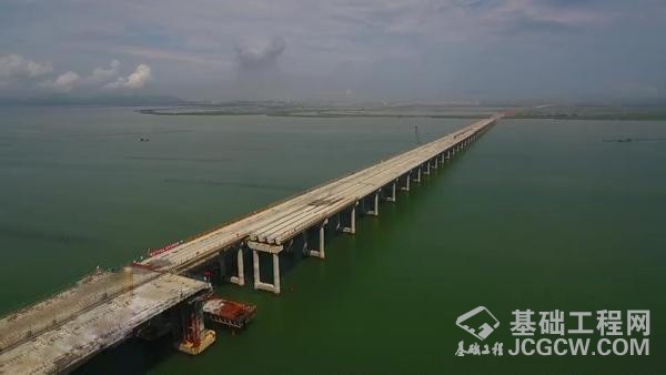 记者在现场看到,海陵岛特大桥已经初具雏形,茫茫大海上似有一条长龙横卧,分外壮观。据介绍,海陵岛特大桥作为关键控制性工程,由主桥、北引桥、南引桥组成,全长3004米。而主桥作为该桥梁的最重要组成部分,全长208米,设计有500吨级的通航孔,右幅已于今年4月18日顺利合龙。