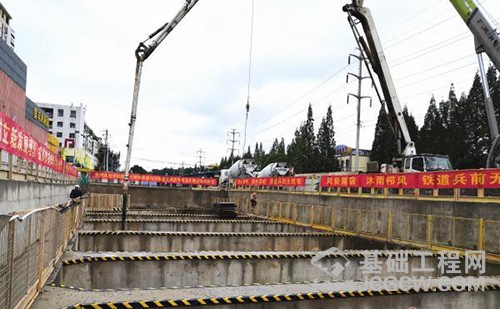 本次浇筑完成的最后一块板为车站一单元顶板,长36米,宽25.2米,约800方混凝土,采用汽车泵送法进行浇筑。