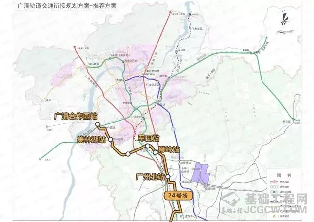 24号线:自白云区引出后,经广州北站,北延至狮岭大道,设狮岭站、军田站,经山前旅游大道,北延至清远,设美林湖站、止于广清合作园站。