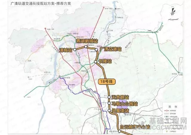 18号线:自白云城市中心站引出后,一路向北,在花都设凤凰南站、马鞍山公园站(与9号线换乘)、天贵路站,再继续北延至清远,设长隆站、广清空港站、燕湖新城站、终于清城站。
