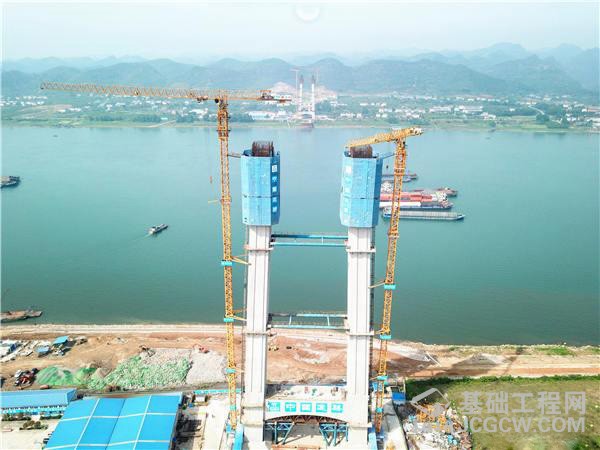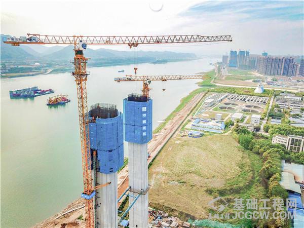 湖北宜昌伍家岗长江大桥主塔封顶 国内首台桥梁“造塔机”完成首秀