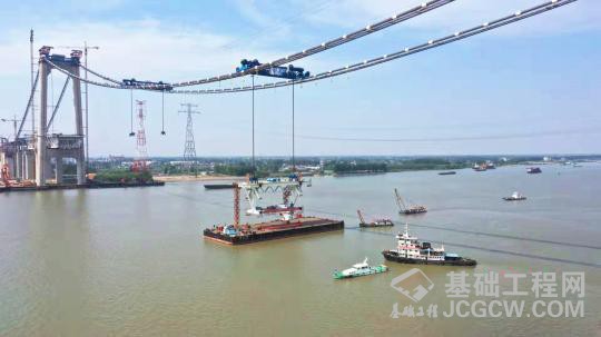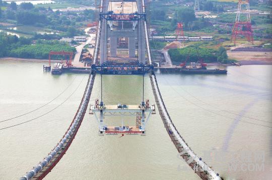 据中铁大桥局连镇铁路项目部常务副经理陈明介绍,钢梁架设由跨中向两侧对称架设,最后在两侧合龙。五峰山长江大桥中跨钢梁为全焊接钢桁梁结构,除跨中间三个单节段钢梁采用单台缆载起重机作业外,其余34个节段均采用两台缆载起重机整体节段进行吊装,最重钢梁节段达1432吨,为目前国内悬索桥钢桁梁最重。