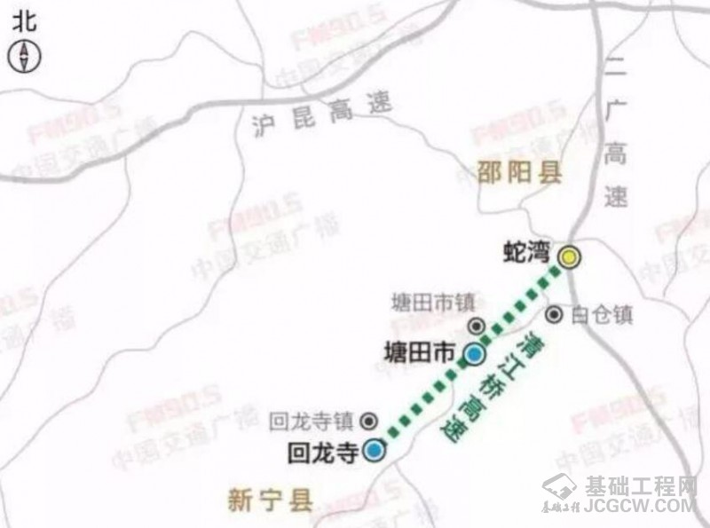 邵阳县白仓至新宁县清江桥高速公路起于邵阳县塘渡口镇蛇湾,与已建的邵阳至永州高速公路相接,止于新宁县清江桥乡,经邵阳县白仓、塘田市,新宁县回龙寺,全长约46公里。