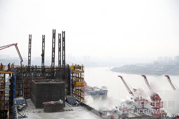 大桥上层为双向8车道,下层为规划的轨道交通18号线预留过江通道。主塔采用空间多曲面水滴形混凝土结构,高236米,相当于84层楼高,是重庆主城区内在建的最高桥塔。大桥主塔共分为55个节段,本次施工完成的主塔中横梁为主塔第10至14节段,横梁长70米,高为8-31米的渐变高度,两个主塔5个节段共浇筑约1万方C55高标号混凝土。