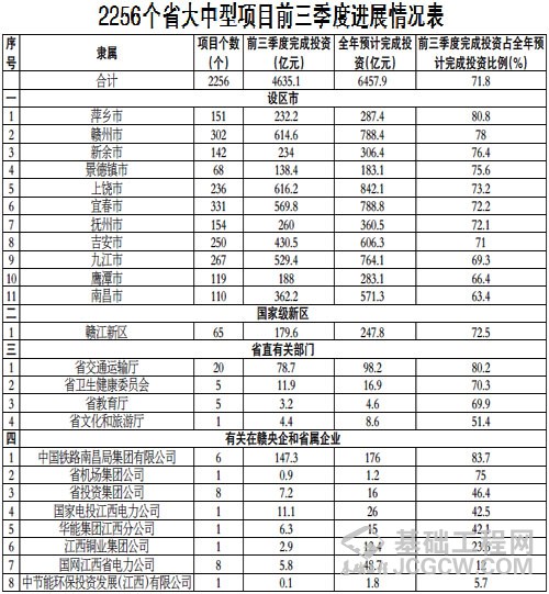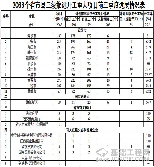 为贯彻落实省委、省政府“大干项目年”活动部署,牢固树立“项目为王”理念,加快推动全省重大项目落地见效,切实发挥投资关键性作用,省发改委按照《江西省人民政府关于印发全省政府系统推动“三减三强两倡导”深化“五型”政府建设推进高质量跨越式发展若干措施(试行)的通知》要求,现将今年前三季度全省大中型项目和省市县三级推进开工重大项目进展情况通报如下: