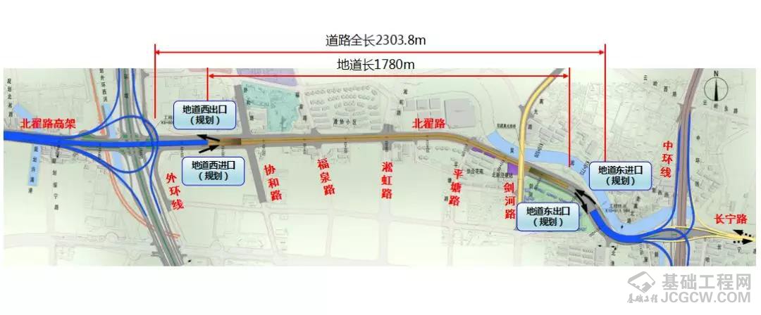 北翟路(外环线-中环线)快速路地道工程位于上海市长宁区,西接现状北翟路外环线立交,东接北翟路中环线立交、北横通道北虹路立交,西向东以地道形式依次下穿协和路、福泉路、淞虹路、平塘路、剑河路,全长1780米。全线设置2对出入口匝道,1对设于外环线东侧,与外环线现有菱形匝道形成北翟路主线与外环线的软连接;另一对位于中环线西侧主线入地段,与向市中心方向的长宁路相连接。主线地道为城市快速路,双向6车道规模,设计速度60千米/小时,为矩形箱涵结构,明挖法施工。