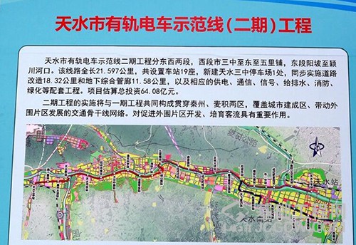 天水市有轨电车示范线二期工程分东西两段,西段市三中—东五里铺,东段阳坡至颖川河口。该线路全长21. 597公里,共设置车站19座,新建天水三中停车场1处,同步实施道路改造18.32公里和地下综合管廊11.58公里,项目估算总投资64.08亿元。