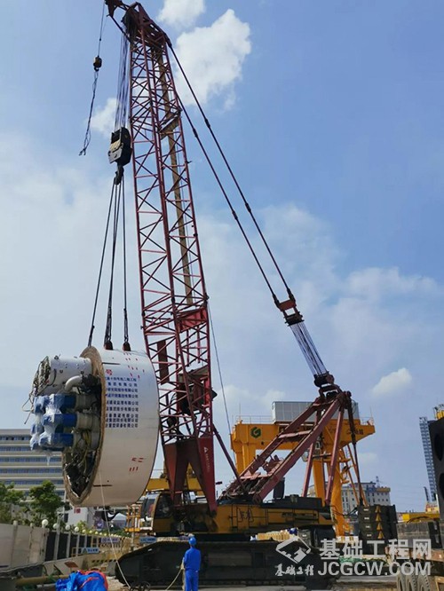 “大壮二号”全长约110米,但由于施工场地狭小,且盾构井底仅有36米长,难以满足盾构机体、刀盘吊装下井组装的条件。为此,施工单位广东华隧集团的地铁建设者们成立了专项攻坚小组,优化地面设施布置和盾构机吊装组织方案,并采取“钢套筒密闭分体”的始发方式,即先在盾构井内设置钢套筒,将盾构刀盘、盾体、桥架以及部分台车吊装到盾构井内的钢套筒进行组装调试后开始掘进施工,再随着盾构机的掘进把剩余部分吊装入盾构井内完成全部拼装。这一做法有效解决了狭小空间内设备布置、材料运输空间不足等困难,而钢套筒的密闭空间也能提供平衡掌子面的水土压力,避免了盾构机始发过程中压力不平衡带来的风险。