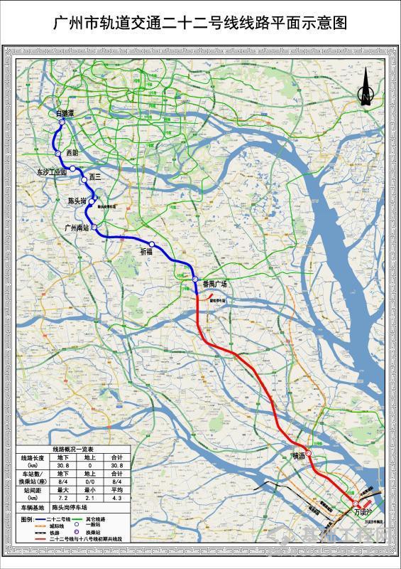 二十二号线属市域快线,线路全长30.8公里,设计时速160千米每小时。南起番禺广场站,向北延伸至白鹅潭站,全部采用地下敷设方式,共设8座车站及1座停车场(均为工程暂定名)。建成后,将在番禺广场至万顷沙段与十八号线共线运营。