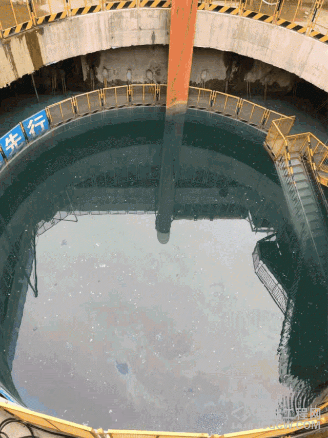 最后清理基坑内泥水,成功接收的盾构机缓缓显露出来。