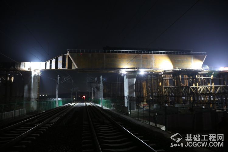 11月6日23:40,新建潍莱高铁跨青荣铁路特大桥32号墩框架墩钢横梁,以每分钟2米的速度,经过4小时要点施工,顺利通过了既有青荣铁路,完成了营业线Ⅱ级拖拉施工。