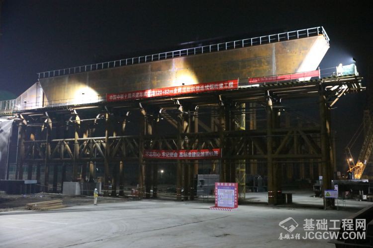 据了解,青荣铁路来往车辆较为密集,每5-10分钟就有一趟列车通过,为减小对铁路运营的影响选择夜间要点施工。此次要点施工存在三大难点,一是施工工艺工序复杂,框架墩钢横梁为全焊接耐候钢横梁,焊接施工难度大,质量控制要求高;二是安全压力大,施工过程中邻近营业线施工,拖拉施工跨越青荣铁路;三是施工时间短,要点施工保证4小时内完成,选用自动控制系统控制200t连续千斤顶,连续作业实现拖拉施工,有效的保证了拖拉的稳定及速度,拖拉前钢横梁接长导梁有效的解决了在拖拉过程中钢横梁倾覆的的安全风险。