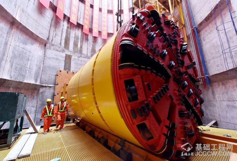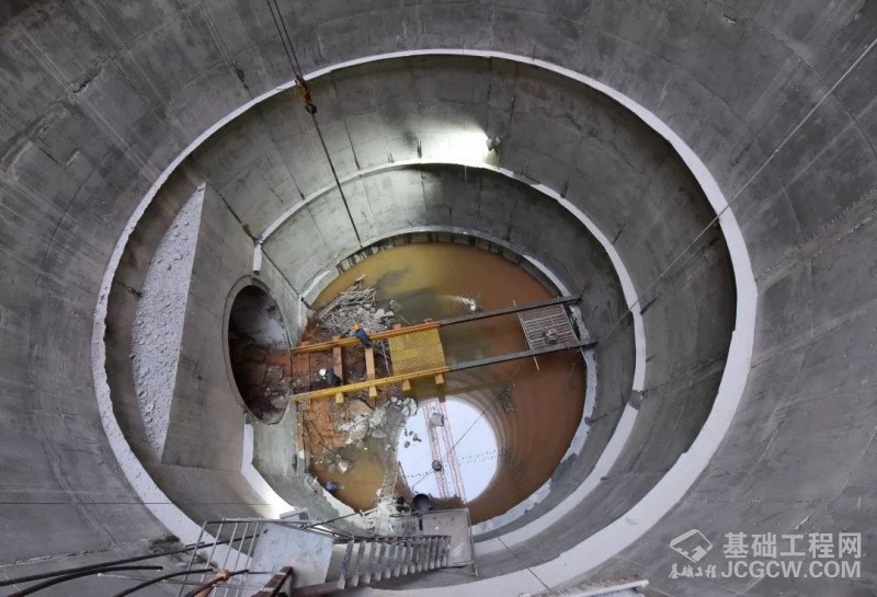 在深达46米的巨型工作井底部,像火车头一样巨大的顶管机头,伴着隆隆的掘进声,顶管掘进机头从湖床深处破石而出,施工人员立刻对洒出的岩石砂砾进行清理,迅速收集溢出湖水,准备循环利用。