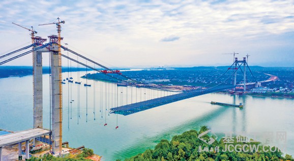 白洋长江公路大桥是呼(和浩特)北(海)高速公路跨越长江的控制性工程,为双塔钢桁架悬索桥,全长2160 米,采用一跨过江设计,主跨1000米,预计2020年10月通车。