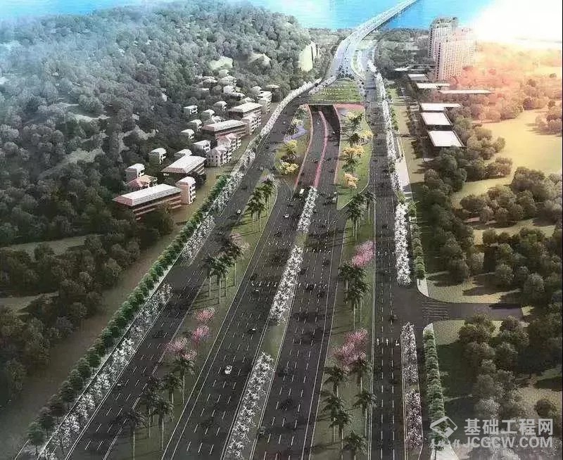 隧道的绿化工程计划从海文化延伸到“帆船”意象,抽象岀帆船流线型的绿化带,下部分采用海浪波纹形状。