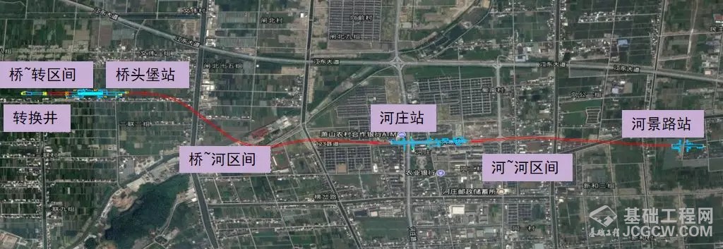 河景路站~河庄站区间呈东西走向,区间线路出河庄站后沿河景路向东延伸,450m后向东南方向偏转,绕避城隍庙直湾桥,下穿城隍庙直湾、建筑物、河庄横河、在建综合管廊,然后下穿新河村4组居民区,进入河景路站。线路沿线分布建(构)筑物主要有帝景苑、河庄中学、城隍庙直湾桥、向公中桥、综合管廊等。