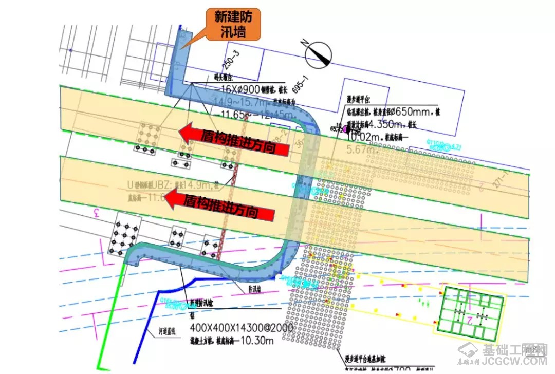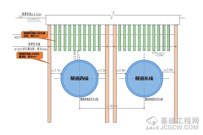 盾构垂直穿越浦西防汛墙(改建后)基础为钻孔桩,上部结构为钢筋混凝土结构,其桩基距离隧道顶部最小垂直距离约2.3m,距离隧道水平距离最小约为2.3m。