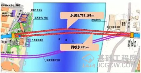 江中盾构段圆隧道管片内径10.40m,外径11.36m。盾构隧道分西线、东线两个区间,其中西线隧道长781m,东线隧道长785.166m,采用2台盾构先后从浦东工作井出洞至浦西工作井进洞。隧道最大坡度5.00%,最小平面曲率半径为600m,隧道中部设置一处连接通道。