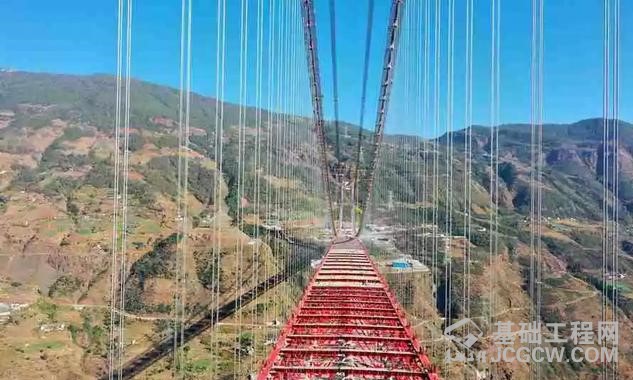 金安金沙江大桥主跨1386米,是目前世界上最大跨径的山区峡谷悬索桥。桥面与谷底河面垂直高差达330米,主塔塔顶距江面近500米,跨越金沙江。全桥整体桥面在全球首次采用“U肋全熔透焊接”形式,同时,大桥所用的缆索吊也是世界山区桥梁建设同等吊重中最大跨径、最先进的缆索吊,额定吊装重量达220吨。