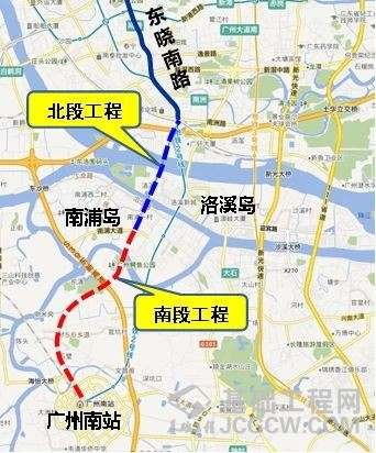 东晓南路-广州南站连接线工程北接现状东晓南路高架,南连广州南站,纵跨海珠区与番禺区,路线全长约9.5公里,道路等级为城市主干路,双向6车道,设计速度60公里/小时。该项目采用过江隧道下穿珠江后航道与三枝香水道,采用桥梁跨越大石水道;全线设置5个立交(北往南分别为南洲路立交、环城高速立交、南浦大道立交、南大干线立交、广州南站立交),实现与东晓南高架、南环高速、南浦大道、南大干线等沿线主要道路的交通转换。项目以南浦大道为界,分成南、北两段建设,其中南段工程已于2019年9月开工,预计2022年建成;北段工程预计2023年建成。