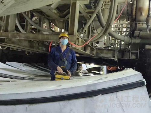 基岩段岩石主要为中微风化花岗岩,根据项目地勘揭露岩石最高强度已达216兆帕。由于基岩岩石强度高,刀具破岩承载大受力复杂,易出现刀具异常损坏,包括偏磨悬磨开裂及崩刃等。掘进过程中刀具持续受到高频冲击交变荷载,刀具螺栓易松动断裂,刀具更换频率高。海中182米基岩段掘进因刀具螺栓松动断裂、刀具磨损共计换刀225次,平均每掘进1米需要更换刀具1.2次。过程中项目组织技术人员对刀具配置进行了优化,采用重型滚刀并且加宽刀刃厚度,着重对刀圈进行了梯度硬度的升级设计,采用外刚内柔的理念克服岩面高强度。还在此基础上进行了一系列创新,如常压滚刀防后退监测装置、常压滚刀刀具安装优化创新、刀具螺栓强制防松等优化。