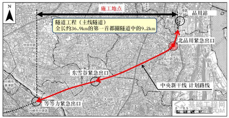 作为始发井的北品川紧急出口已于2019年12月完工。盾构机自北品川地下80m深处始发后,将下穿地下50m深的首都高速中央环状品川线,经由东雪谷紧急出口(东京都大田区),到达等等力紧急出口(川崎市中原区)。完成掘进后,计划把该盾构机的一部分二次利用在北品川至品川站区间的掘进施工中。