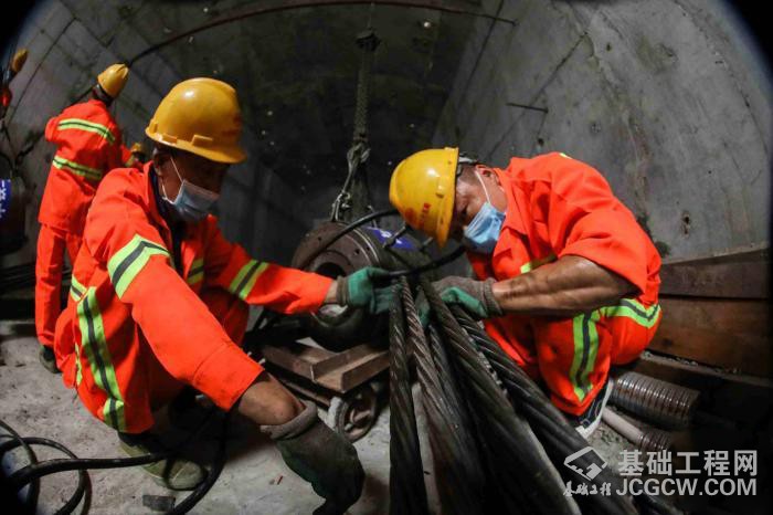 施工人员安装锚具开展张拉作业