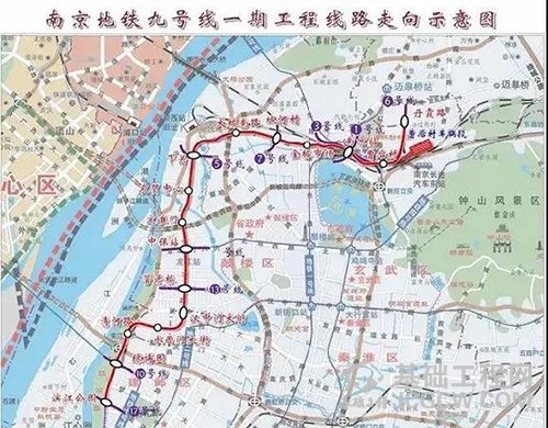 南京地铁9号线一期工程北起丹霞路站,南至滨江公园站,途径玄武区、鼓楼区和建邺区。