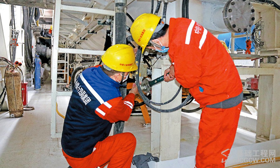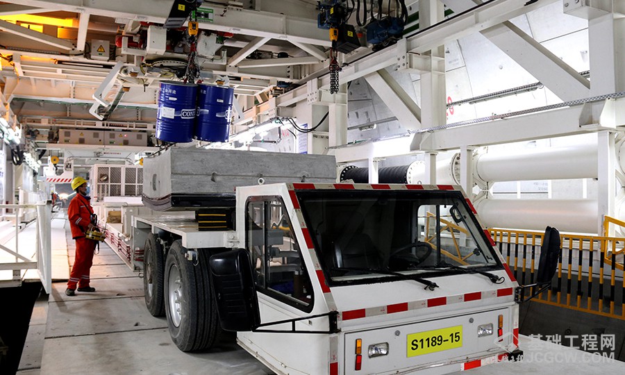 图为盾构隧道内,吊机操作手正在吊装盾尾油脂桶。
