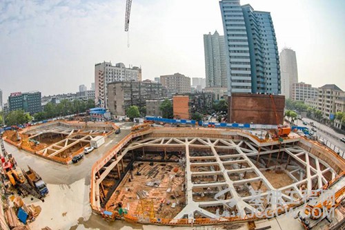 此次完成车站主体围护结构的丁公路北站,位于丁公路与北京西路交叉口西南侧核工业地块内,沿丁公路呈南北走向布设,为4号线与1号线换乘车站。车站总长(内净)165.241米,站台宽度16.5米,标准段净宽23.8米,南端头井净宽27.5米,北端头井净宽31.4米,为地下三层岛式车站。