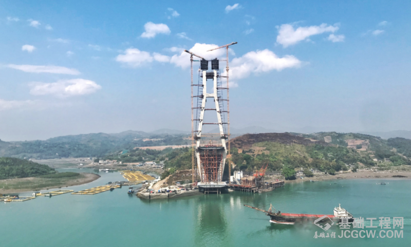 大桥主塔采用花瓶形桥塔,断面为空心箱型,主要施工包括桩基基础、承台、塔座、塔柱、横梁、塔冠、装饰块、钢锚梁等。大桥主塔相当于68层楼的高度,均采用液压爬模工艺进行节段混凝土浇筑施工。其中,北主塔高189.4米,单个塔肢共43节段。