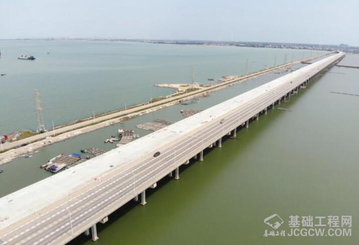东海岛特大桥采用设计速度100公里/时的四车道高速公路标准建设,桥面净宽19.25米,设计荷载为公路Ⅰ级,无通航要求,设计全长4.38公里,其中水域长度约2.43公里。